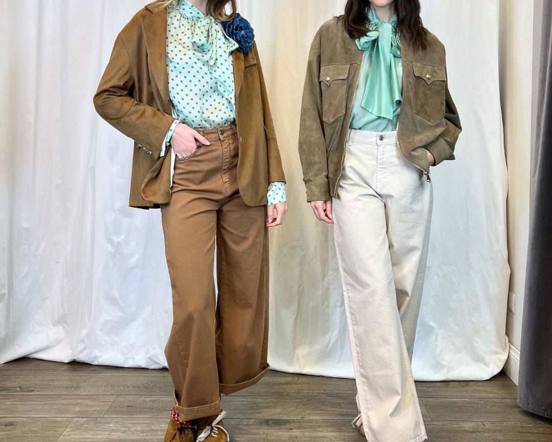 Discover the perfect balance between elegance and comfort with these two exclusive outfits, available on Blackoutroma . The first look is characterized by the oversized camel jacket , which blends with the Superpocket drill trousers in tobacco for a sophisticated but bold result. The aqua polka dot bow shirt adds a fresh and romantic touch, while the sneakers complete the look with practicality and style. The second outfit plays on warm and versatile shades: the camel deerskin jacket is ideal for mid-seasons, combined with the mint bow shirt for a chic and contemporary effect. The beige Mia jeans trousers and sneakers give a casual and modern touch, perfect for every day.