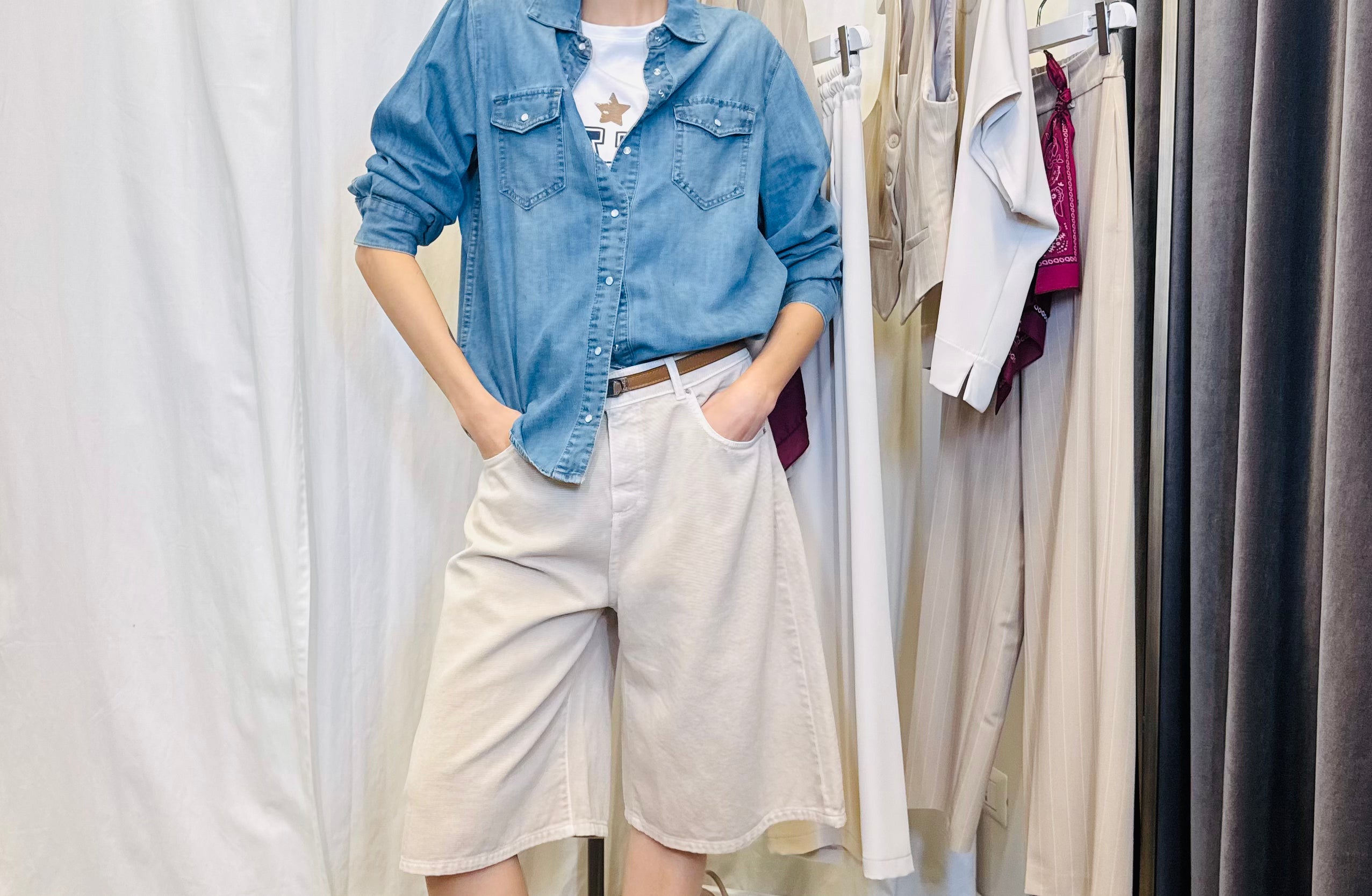 Revolutionize your wardrobe with the outfit that combines denim, bold textures and statement accessories for a contemporary street style look, ideal for spring summer 2025. The beige denim Harper Bermuda shorts by Vicolo are paired with the denim shirt for a total look with neutral and sophisticated nuances. The white Varsity t-shirt gives a sporty and clean touch, while the blue Ritz hat breaks the mold with personality. The detail that makes the difference? The leather belt with padlock buckle, perfect for highlighting the waist with a bold accent. The look is completed by the suede sneaker , essential and versatile. Shop now on BlackoutRoma and recreate your trendy outfit.