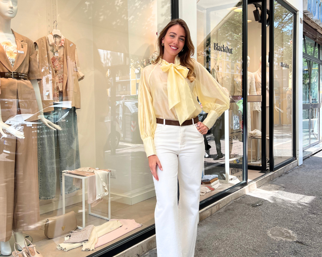 There is a new way to shine, and it is made of bold but measured choices. The yellow bow shirt vibrates with new energy, bright and sophisticated. In contrast, the white jeans clean the lines and illuminate the figure, while the leather-colored suede slingbacks add a warm, material, almost sensual note. It is the new urban code of 2025: decisive, essential, but never predictable. Available now on Blackoutroma – for those who want to stand out, without having to raise their voice.