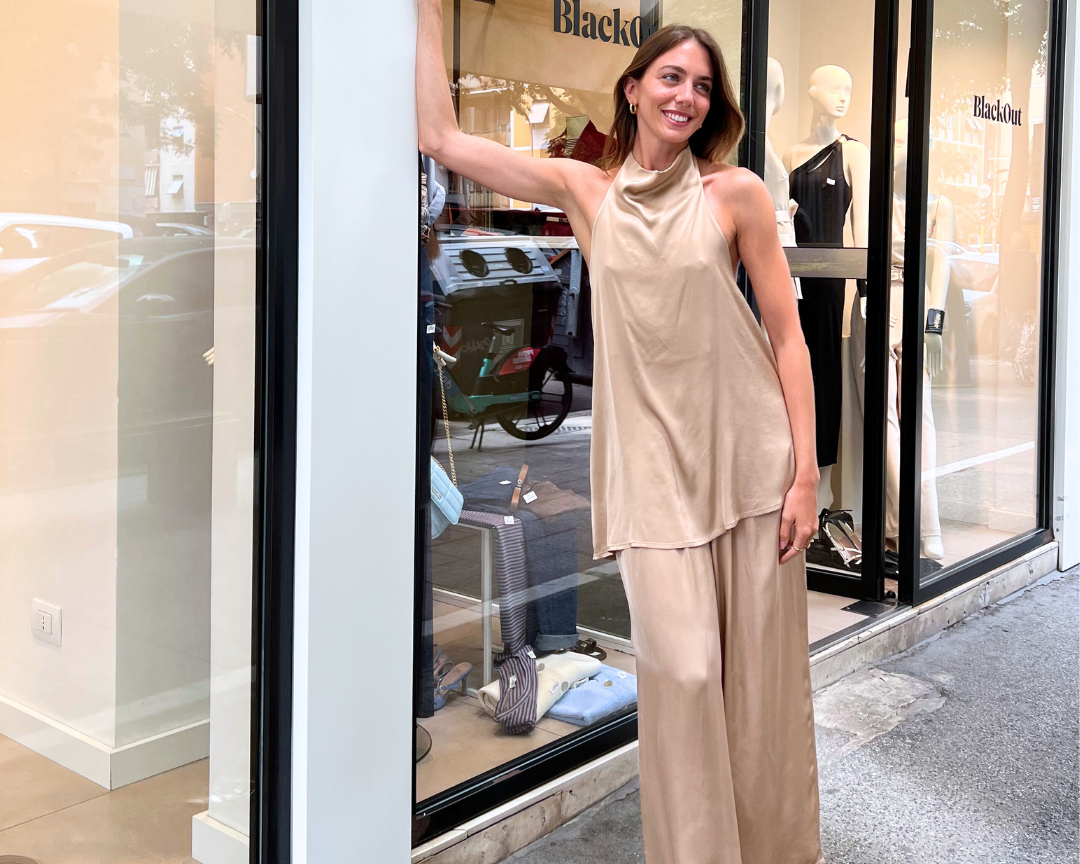 Refined minimalism and a sophisticated palette: the Tensione In set in taupe - low-cut back top and elasticated trousers - perfectly interprets the 2025 trend of relaxed elegance. A versatile and contemporary outfit, perfect for tackling the city in style, without sacrificing comfort. The platinum slingbacks add a luminous touch that enhances the look with femininity and personality. Discover this exclusive combination on Blackoutroma and make taupe your new style statement.
