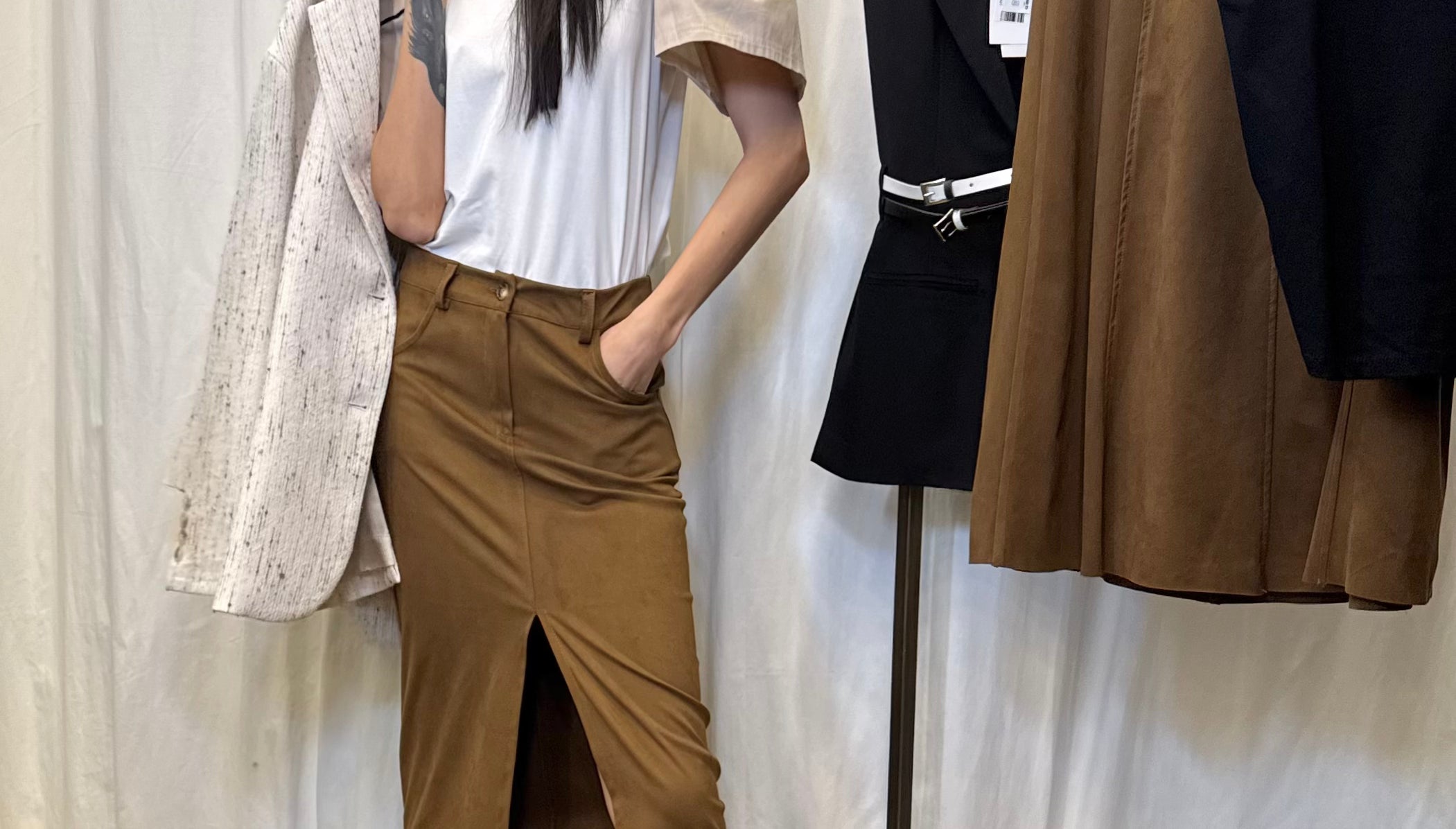 An outfit with a sophisticated charm and warm tones, perfect for expressing personality with style. The white crew neck T-shirt gives a minimal and refined touch, while the oversized patterned jacket adds character and originality. The cognac suede skirt with slit enhances the silhouette with elegance, completed by the leather-colored suede slingback shoe , which gives a touch of class and femininity. Bring your wardrobe to life with exclusive pieces from Blackoutroma!