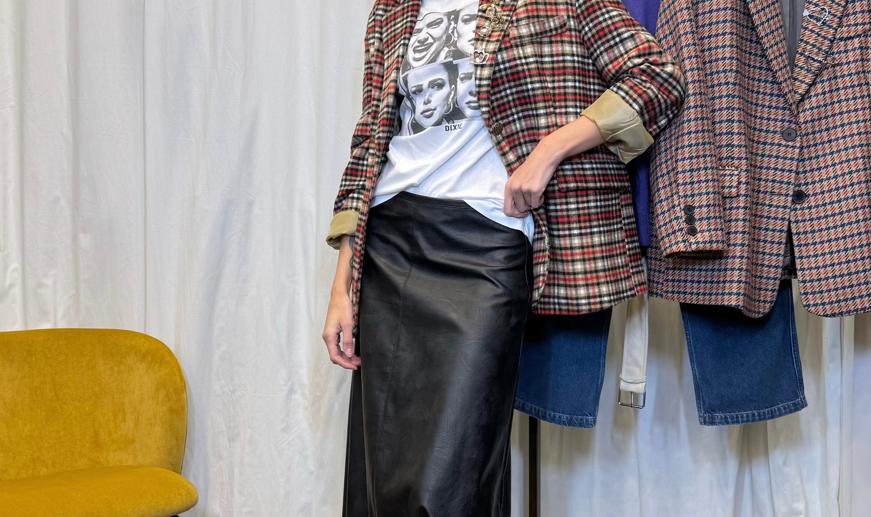 Update your wardrobe with an outfit that combines grit and sophistication. The masculine-cut check blazer, paired with the faux leather midi skirt, creates a perfect mix of elegance and urban trend. Complete the look with the Dixie graphic t-shirt, for a casual-chic touch, and the chunky ankle boots, a must-have in 2025 for a contemporary and decisive style. Discover these items on our website and let yourself be won over by the quality and unique design of the best Italian brands. Don't miss the chance to stand out with Blackoutroma!