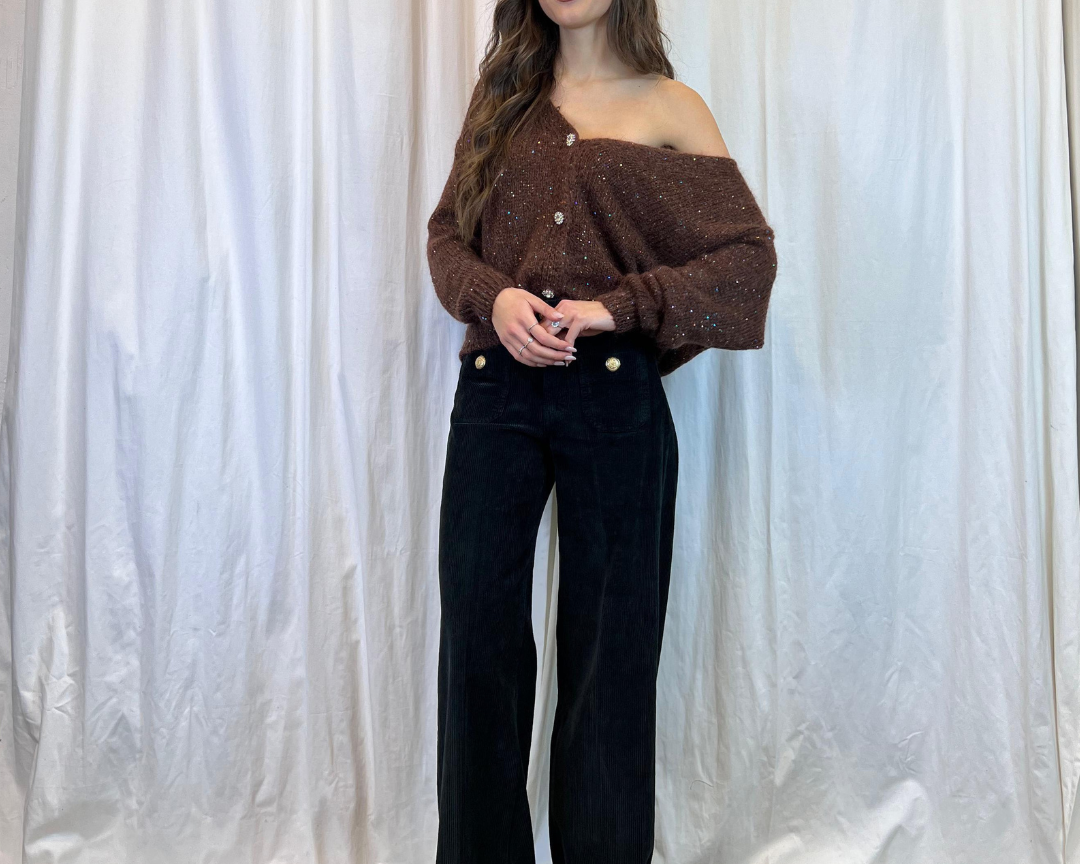 Add a touch of sophistication to your winter with this glitter knit cardigan that combines comfort and style. Paired with high-waisted black velvet trousers with gold details, the outfit enhances your silhouette with a sober touch. Perfect for a casual chic day look or elegant evenings, this mix of textures and warm tones adapts to any occasion.
