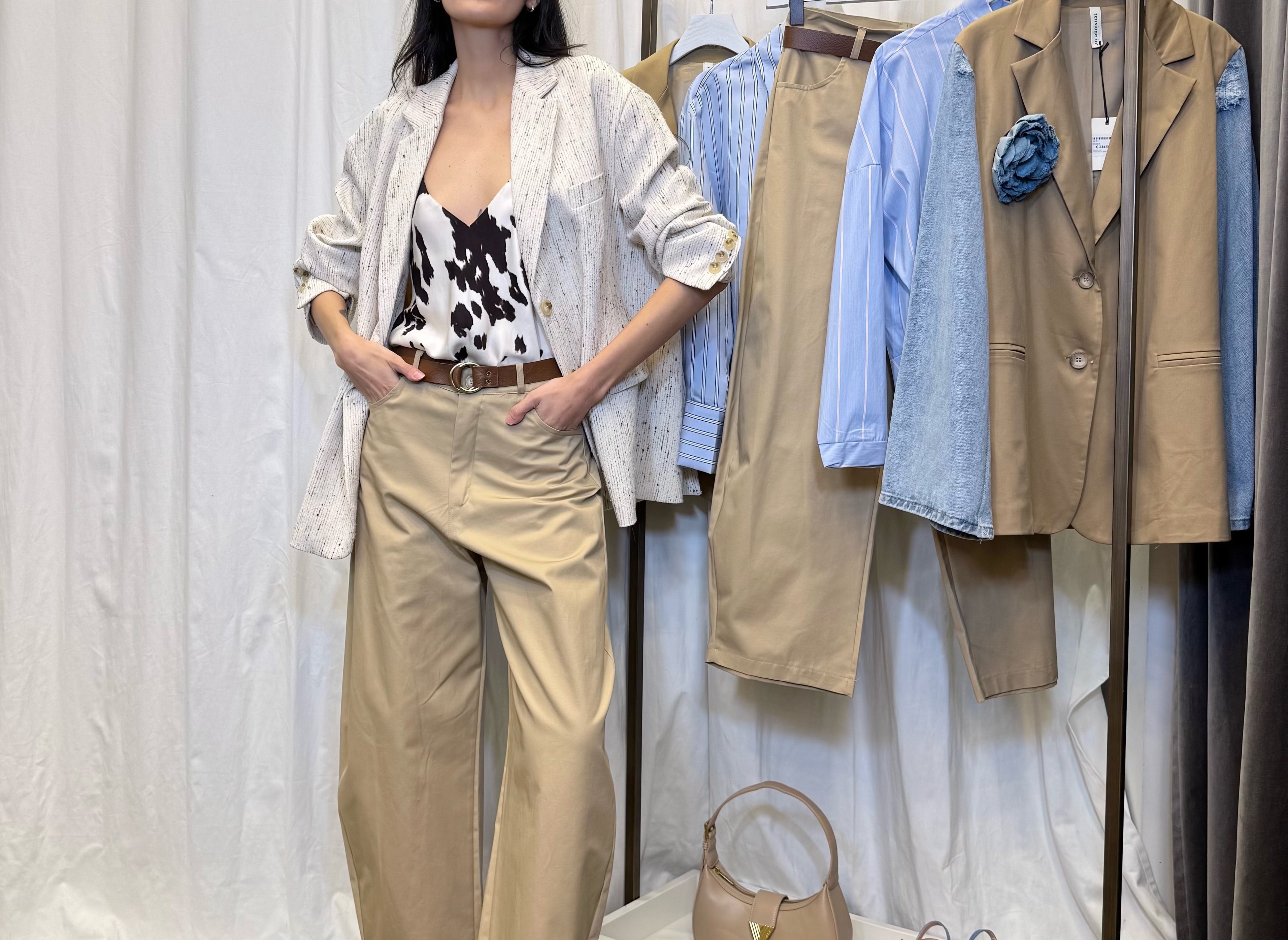 A refined and trendy look that combines neutral shades and bold prints. The linen effect blazer , light and versatile, is the ideal garment for the mid-season, while the top animalier cow print gives a bold and contemporary twist. I sand-colored wide leg trousers , perfectly balanced by a leather belt , slim the figure and guarantee an impeccable fit. All completed by pointed décolleté with metallic details , for a chic and decisive touch. Discover these must-haves on Blackout Rome and create your own outfit with metropolitan charm!