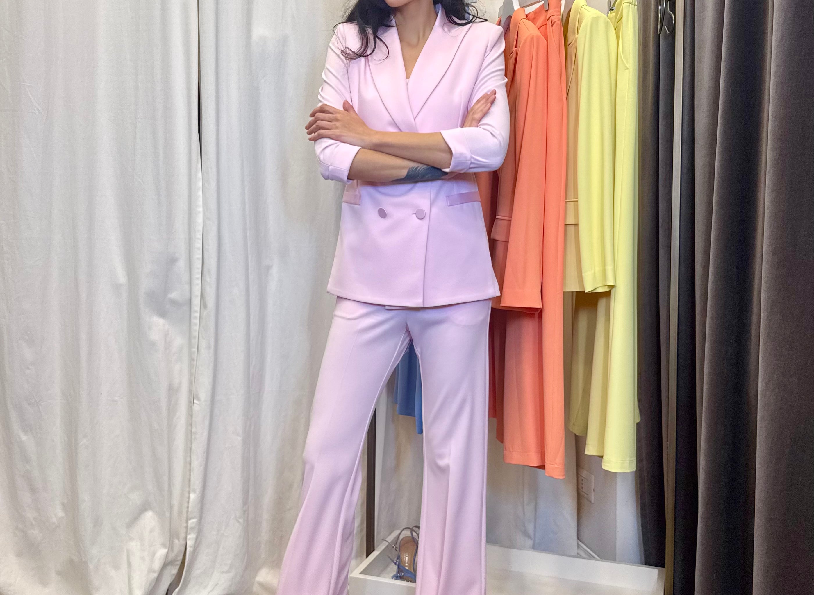 An outfit that interprets femininity with character, blending candy pink with the sophistication of a tailored suit. The double-breasted jacket by Imperial, with a structured cut, conveys strength and style, while the matching flared trousers slim the figure with modern elegance. The platinum-colored slingbacks , bright and light, add a touch of glam perfect for the most special occasions. A look designed to stand out with grace and determination. Discover it now on Blackoutroma and make your wardrobe even more irresistible.