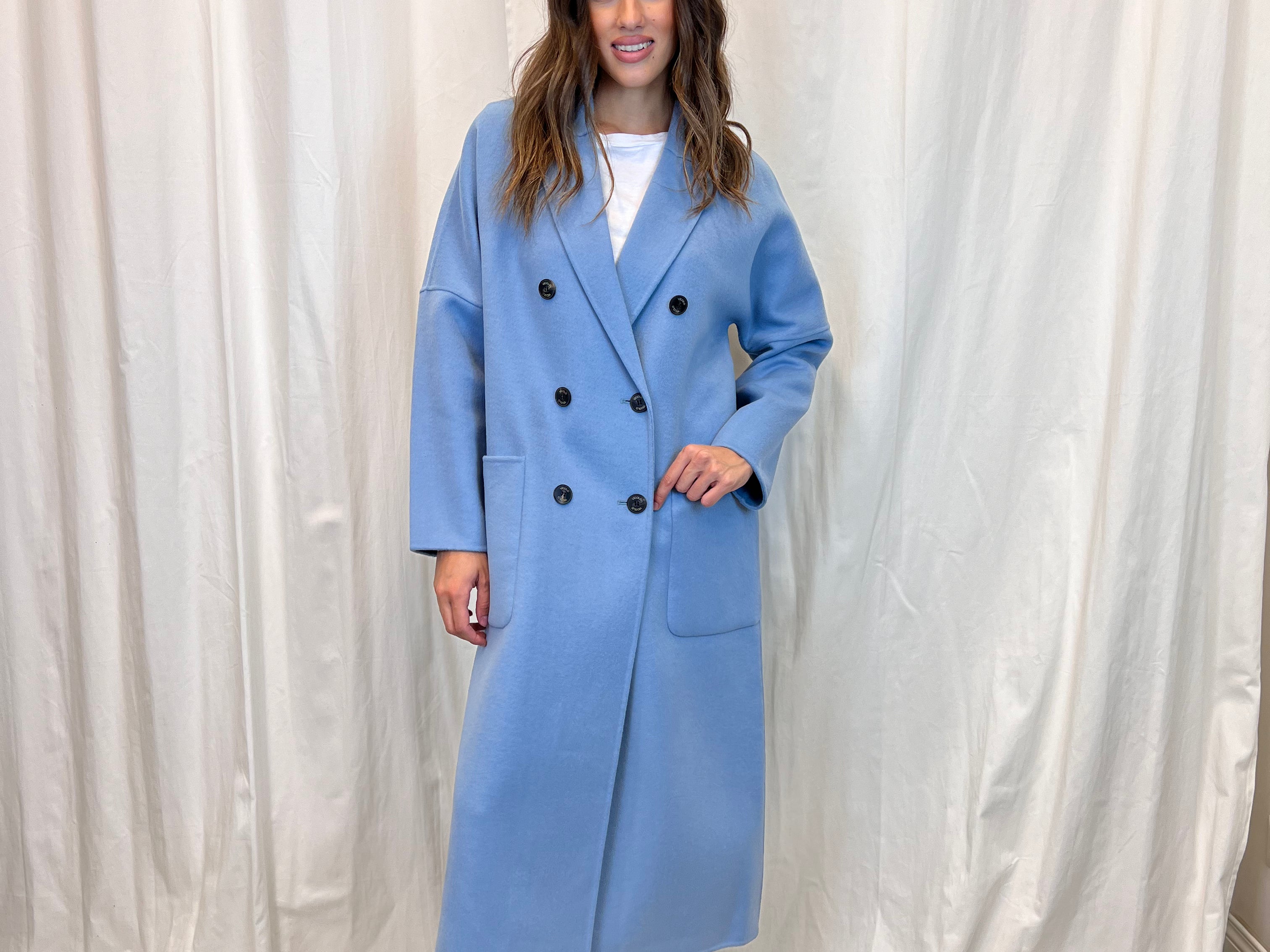 The Cielo Invernale outfit combines a clean-cut light blue coat with elegant trousers. Ideal for facing even the coldest days with class and comfort.
