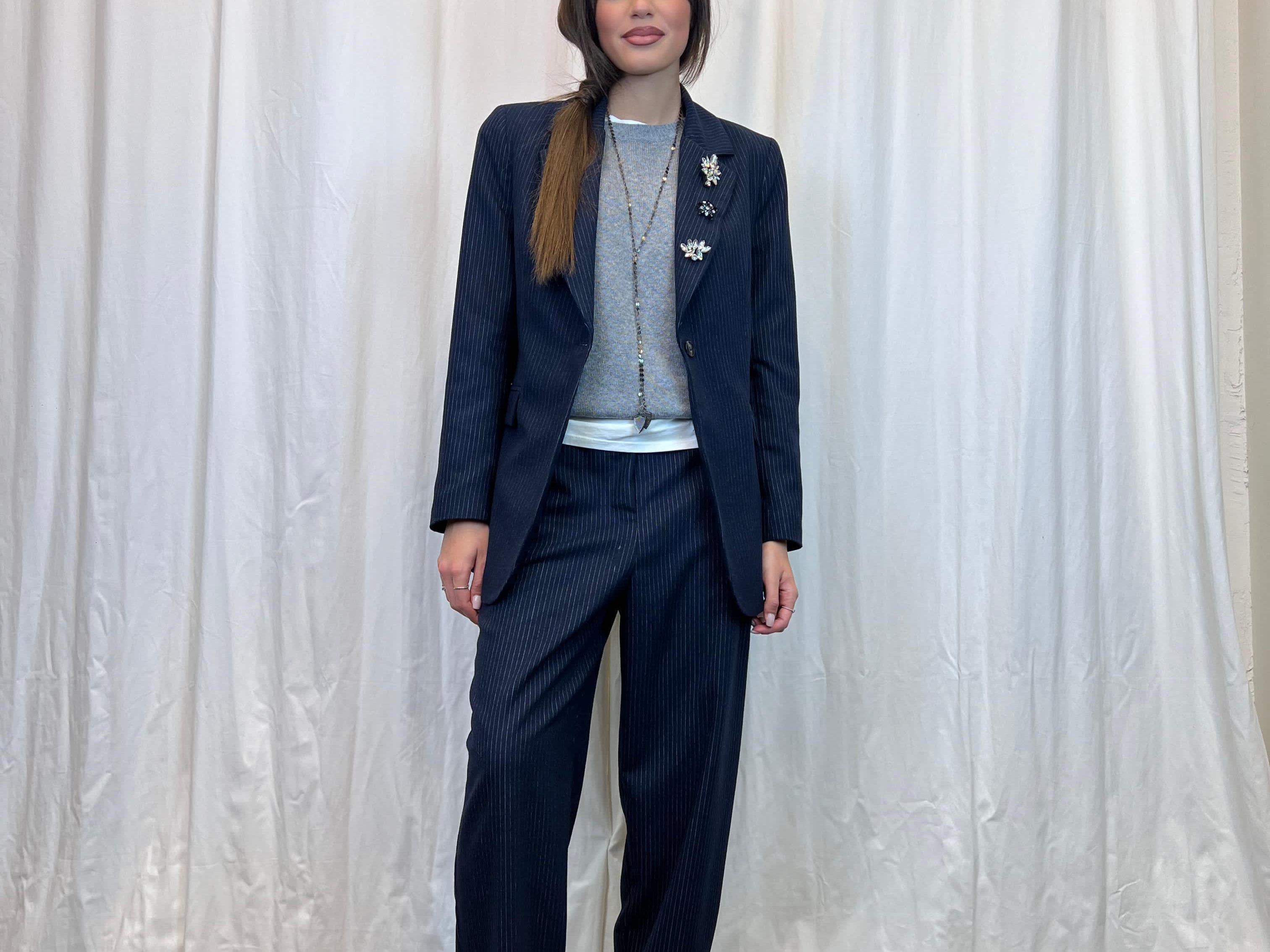For fall ceremonies , opt for timeless elegance. The Tensione In midnight blue pinstripe suit, with a tailored cut and sophisticated texture, is paired with a grey melange sweater for an outfit with a contemporary touch . The jeweled accessories on the blazer enhance the style, while metallic pumps complete a refined and modern look.