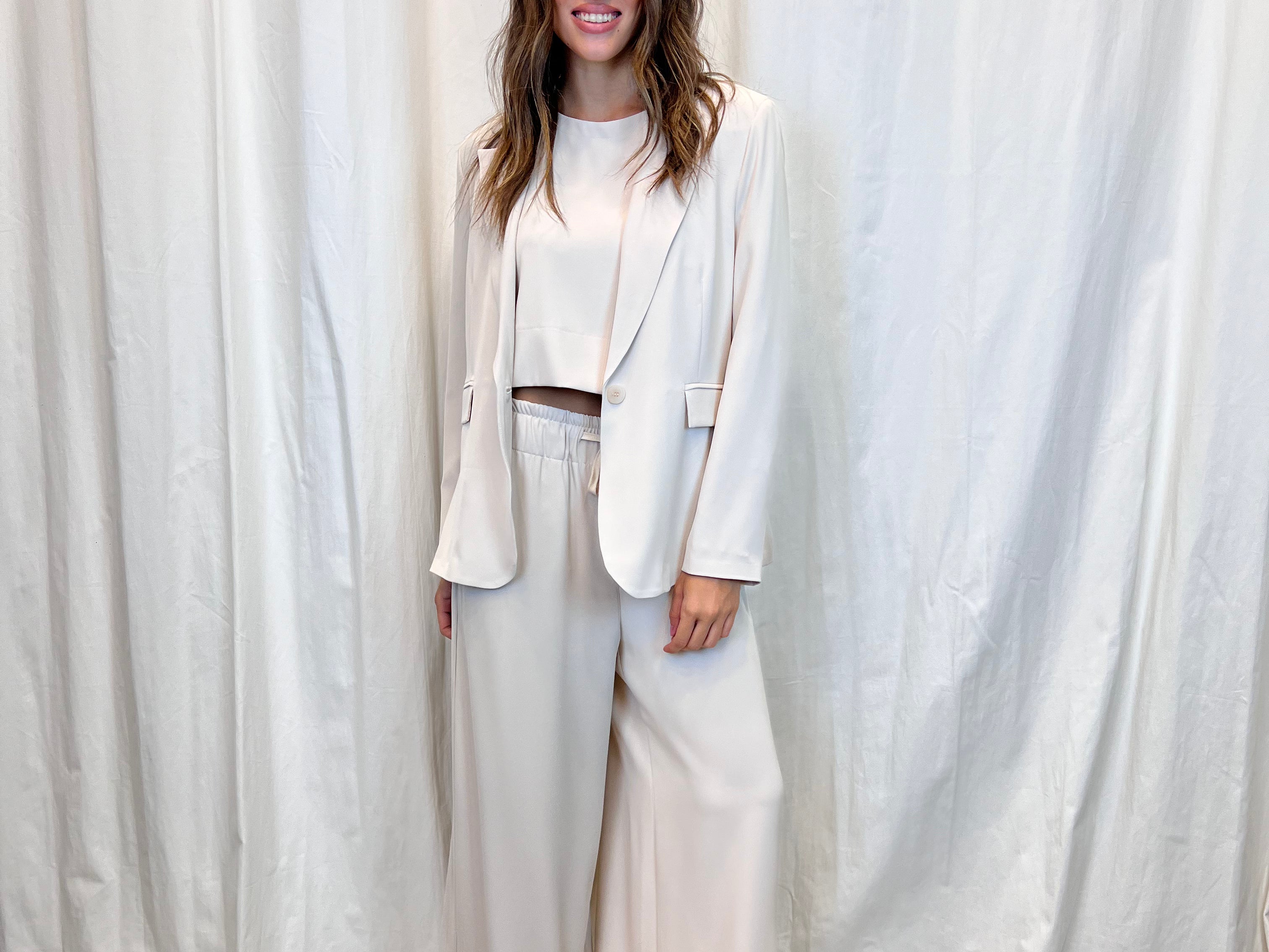 The Total White Mon Amour outfit is the essence of elegance: Tensione In jacket and trousers in pure white, perfect for a sophisticated casual style.