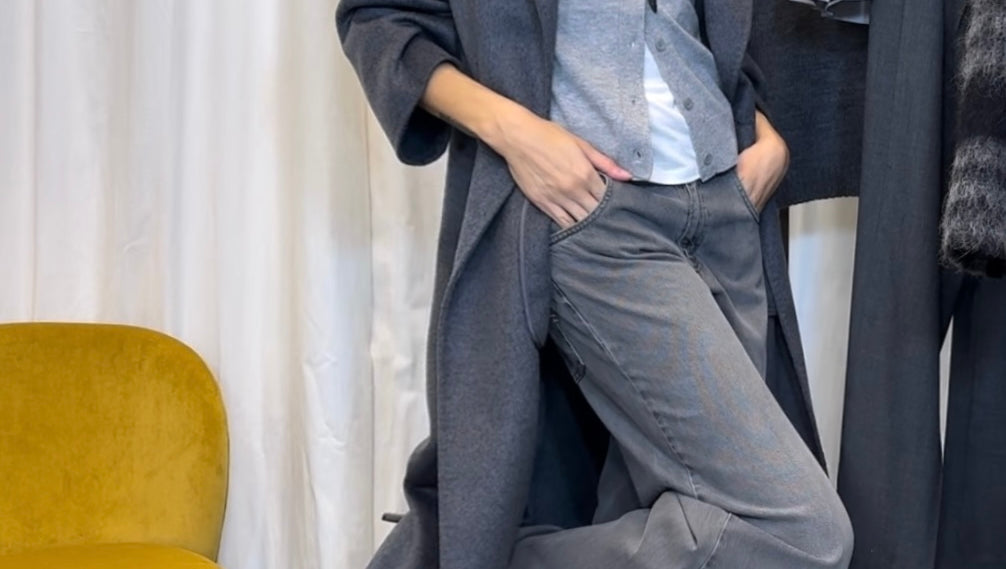 Discover the monochromatic elegance of an outfit in shades of gray : oversized Vicolo coat, minimal cardigan and high-waisted jeans in tone-on-tone. A versatile and sophisticated look for a casual style with a refined allure.