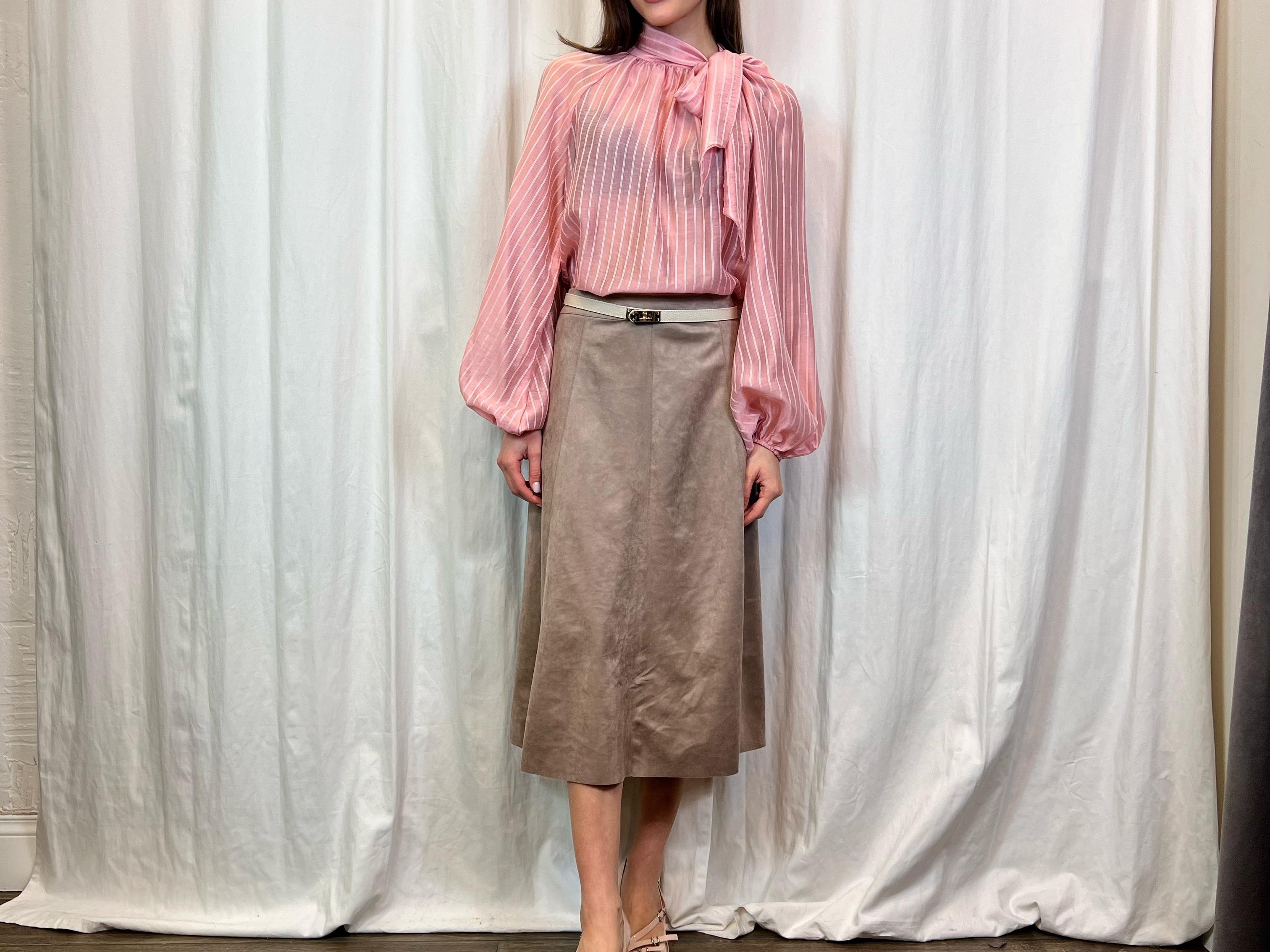 Refined and feminine, this outfit is a perfect mix of lightness and style. The pink blouse with bow and voluminous sleeves adds a touch of romance, while the suede-effect midi skirt in a delicate neutral shade ensures elegance and versatility. The pointed pumps complete the look with grace. Perfect for the office or a special occasion, choose elegance on Blackout Roma!
