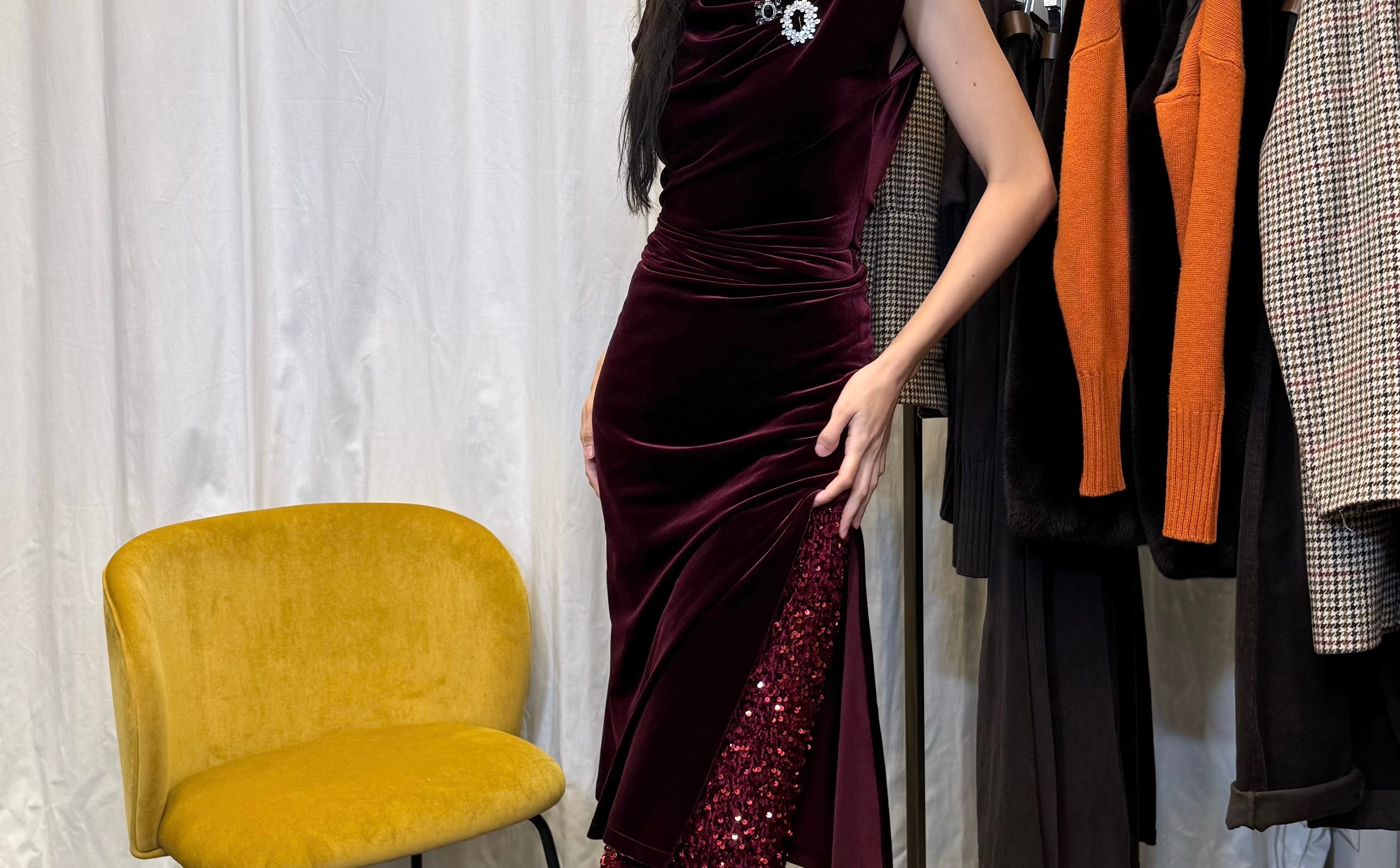 Wear party perfection in this burgundy velvet dress, embellished with a jewel detail. The slit will reveal the sparkling red sequin skirt. Complete the look with bold pumps for a mix of class and strength. Shine in style with BlackOut's style ideas.