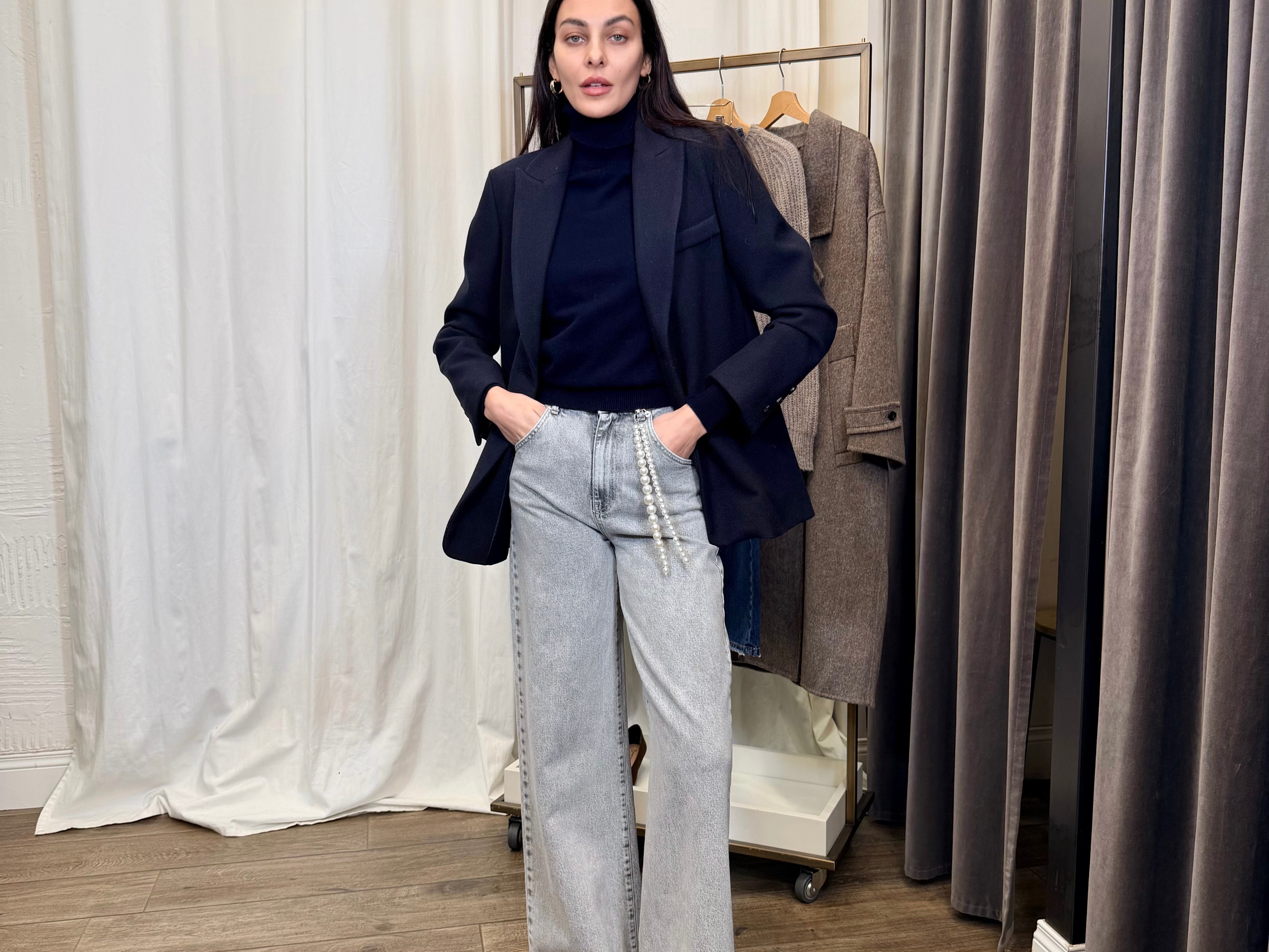 La maglia mezzo collo blu Identity costruisce una base pulita e contemporanea, valorizzata dalla giacca monopetto Tensione In dallo spirito sartoriale urbano. I jeans grigio chiaro Vicolo alleggeriscono il look, rendendolo perfetto dal giorno alla sera. A chiudere, il mocassino nero Divine Follie: deciso, versatile, attuale. Un outfit pensato per chi cerca stile quotidiano con un’identità precisa.