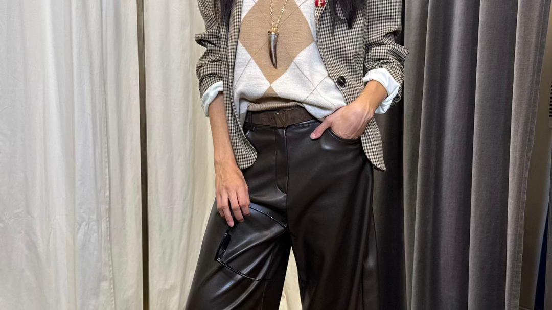 Un look contemporaneo che mescola geometrie e texture, firmato Identity e Tensione In. Il gilet rombi camel/burro crea un contrasto raffinato con la giacca pied de poule con spille e il pantalone ampio in ecopelle caffè, interpretando alla perfezione le tendenze street-chic 2025. Linee decise e dettagli ricercati danno vita a un outfit dal carattere audace, perfetto per chi ama sperimentare senza rinunciare all’eleganza. Scopri su Blackoutroma la combinazione ideale per ridefinire il tuo everyday style.