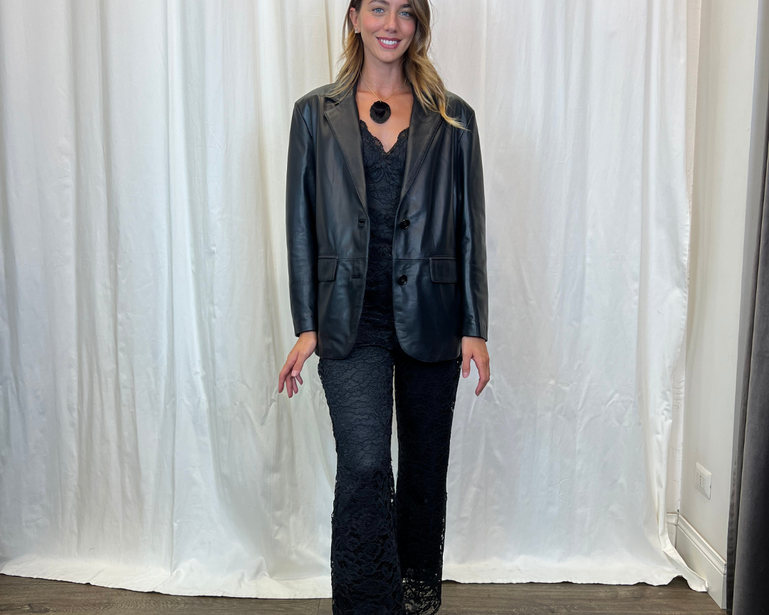 Sperimenta il lusso audace del total black: il top e pantalone in pizzo di Tensione In creano un effetto sofisticato e sensuale, mentre la giacca over in vera pelle di Vicolo e le décolleté con fibbie di Divine Follie donano carattere e forza al look. Ideale per chi desidera un’eleganza contemporanea con un’anima rock e femminile. Acquista subito i singoli capi e costruisci il tuo stile Blackoutroma, deciso e irresistibile.