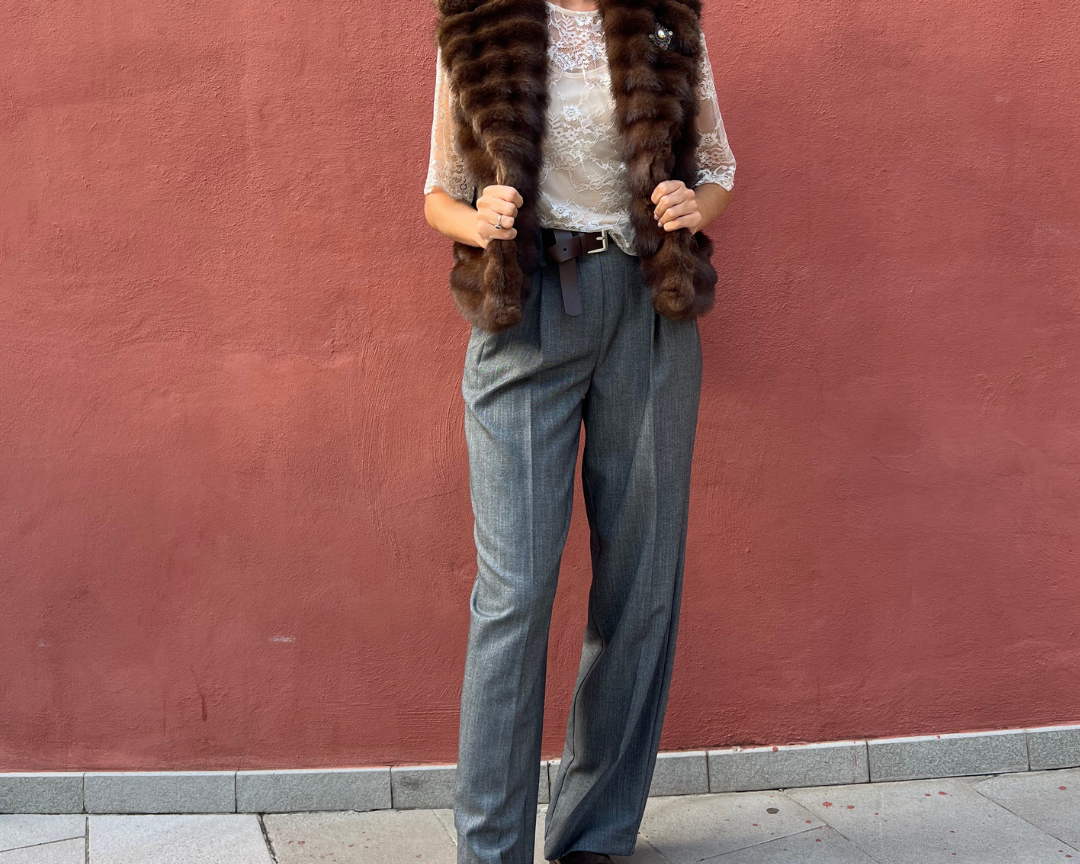 Texture morbide e volumi fluidi definiscono un outfit contemporaneo che unisce la blusa in pizzo naturale e il gilet in ecopelliccia color moro firmati Tensione In. Il pantalone ampio con pence e il mocassino scamosciato Divine Follie completano un look dall’eleganza rilassata, ideale per muoversi tra comfort e allure metropolitana. Lasciati ispirare dalle nuove tendenze 2025 su Blackout Roma.