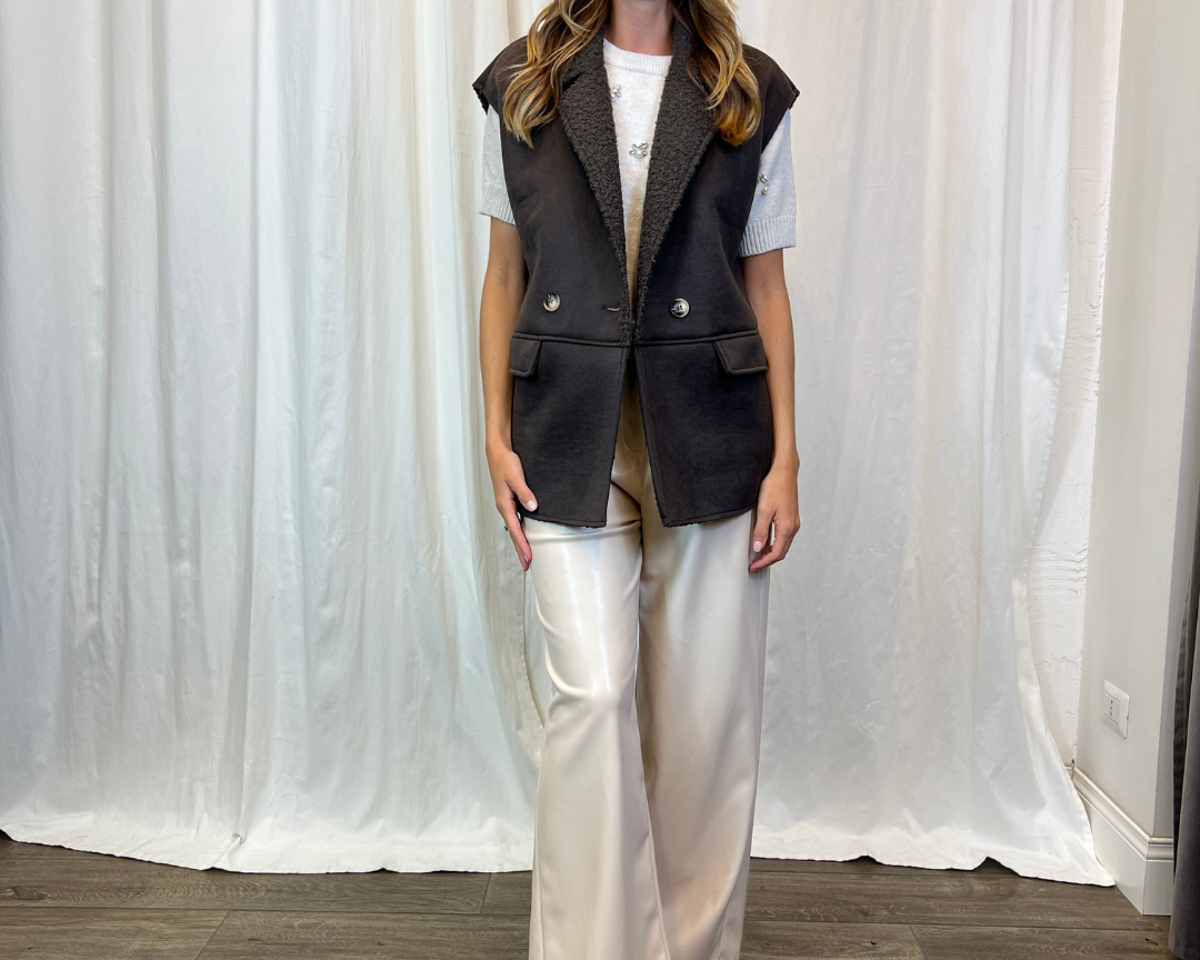 Un look che fonde la morbidezza delle texture e la luce discreta dei dettagli. La maglia AN’GE, punteggiata di micro strass, accende il viso con riflessi preziosi, mentre il gilet doppiopetto in ecomontone Tensione In avvolge la silhouette con calore e carattere. Il pantalone ampio in ecopelle, dal taglio deciso, aggiunge un twist urbano, bilanciato dalla raffinatezza dei mocassini scamosciati Divine Follie. Un outfit che parla di charme metropolitano, perfetto per affrontare l’inverno con sicurezza e stile. Scopri la selezione e acquista il look completo su BlackOut Roma.