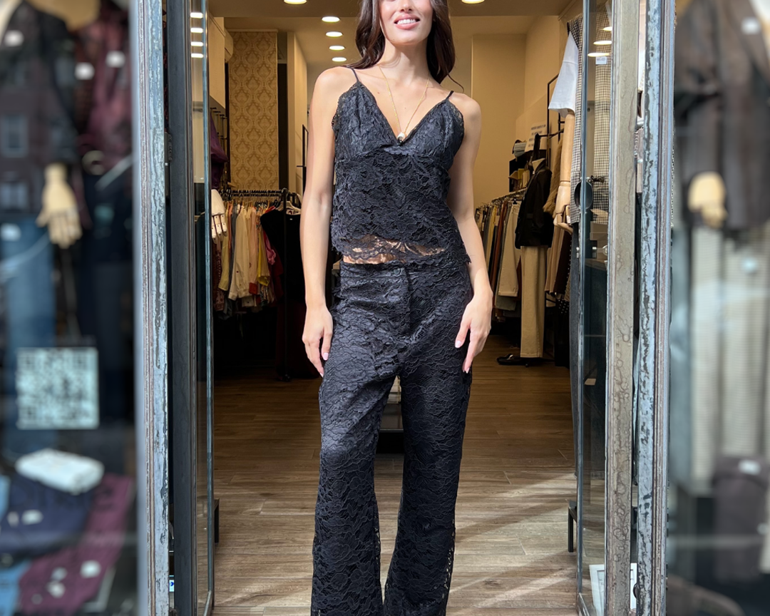 Sensuale, audace, senza tempo. Il completo in pizzo firmato Tensione In reinterpreta il total black con un tocco di eleganza moderna: top e pantalone in coordinato valorizzano la silhouette con texture sofisticate e trasparenze dosate alla perfezione. Le scarpe Divine Follie aggiungono carattere e femminilità a un look ideale per la sera o per un evento speciale. Scopri e acquista il tuo outfit total black su Blackout Roma.