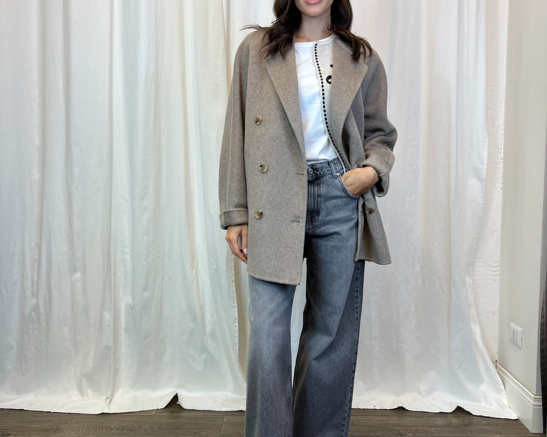Caldo, sofisticato e dal fascino effortless. Il cappotto handmade Vicolo in tonalità tortora incontra la maglia gilet ricamata Tensione In e i jeans grigio Vicolo in un mix di texture e nuance neutre. I texani in camoscio Divine Follie completano un look perfetto per l’autunno 2025, tra comfort e stile senza eccessi. Scopri la soft elegance di stagione su Blackout Roma.