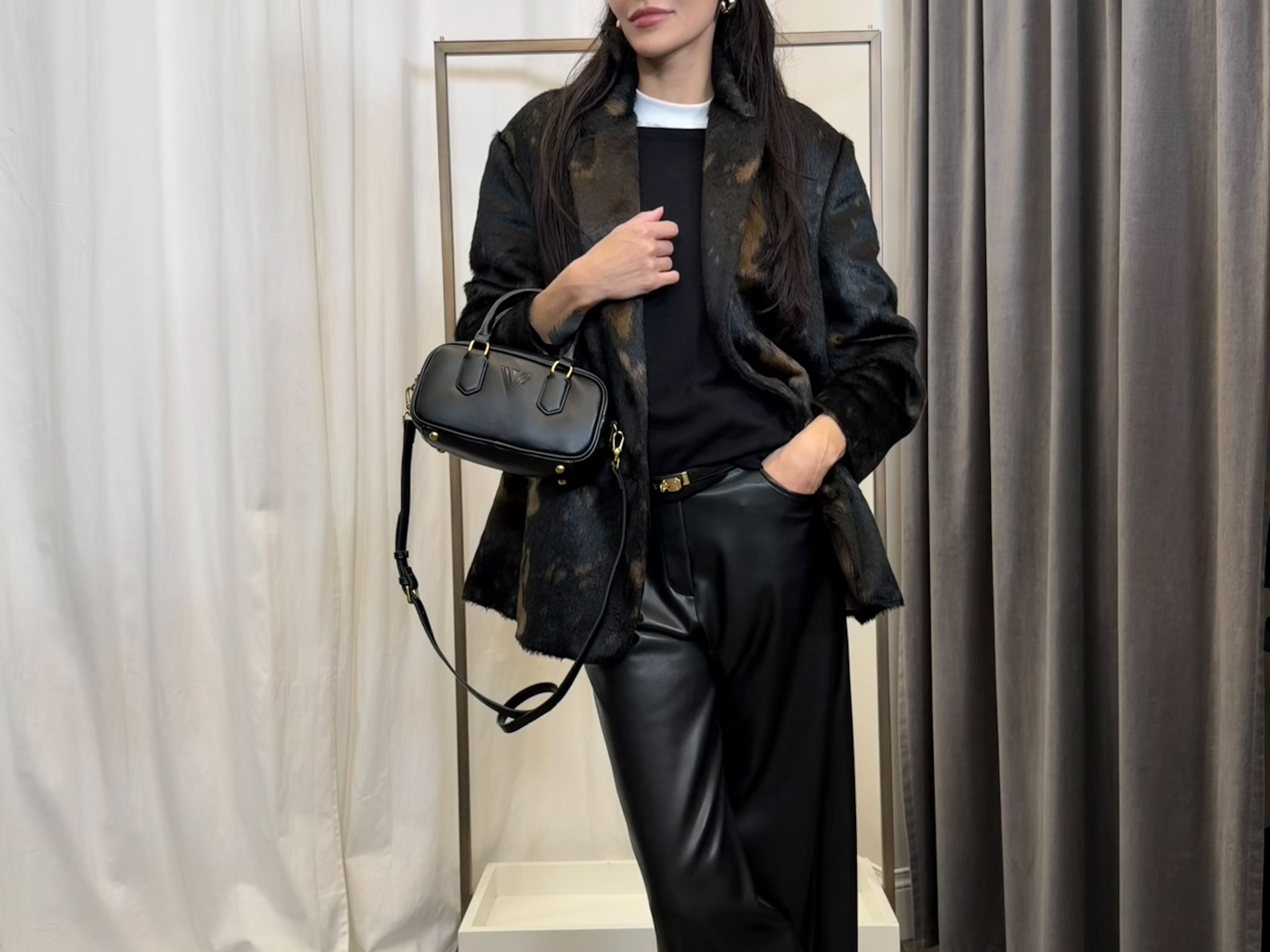 Minimal nel taglio ma audace nei dettagli, questo look firmato Tensione In unisce la giacca cowprint a due bottoni e i pantaloni in ecopelle con tasconi, per un effetto deciso e contemporaneo. A completare l’outfit, i mocassini Divine Follie in pelle nera, perfetti per aggiungere un tocco di carattere urbano. Ideale per chi ama la moda donna 2025 che osa con eleganza. Scopri il total look su blackoutroma.com e lasciati conquistare dal contrasto tra grinta e stile.