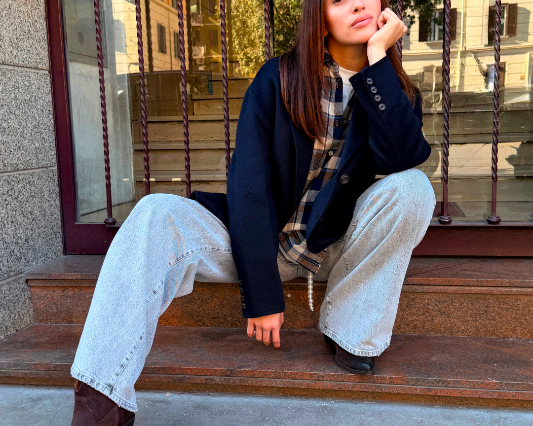 Un outfit che reinterpreta il mood western in chiave urbana. La camicia a quadri Have One nei toni moro si abbina perfettamente ai jeans Vicolo grigio chiaro, creando un equilibrio moderno tra casual e ricercato. La giacca blu a un petto Tensione In aggiunge struttura e un’eleganza pulita, ideale per la stagione. I texani bassi in camoscio Divine Follie completano la combinazione con un accento di carattere. Un look contemporaneo e versatile disponibile su Blackoutroma per rinnovare il tuo stile quotidiano.