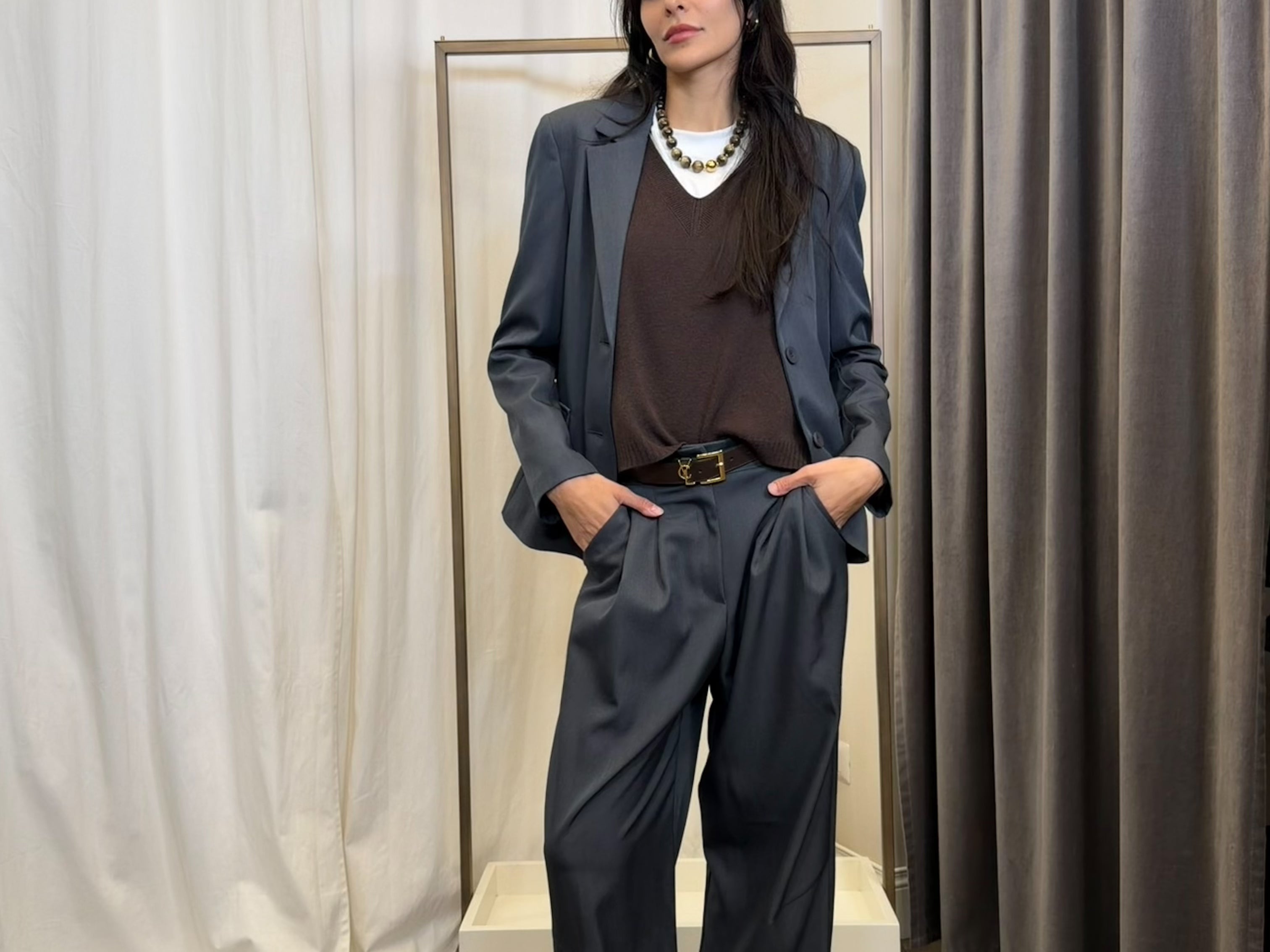 Un look essenziale e sofisticato che porta il tailoring nel 2025 con una nuova leggerezza. La giacca Vicolo e i pantaloni a pences in grigio costruiscono una silhouette fluida e contemporanea, ideale per l’ufficio come per la città. Il gilet a V Tensione In, in caldo marrone, aggiunge profondità e un contrasto materico ricercato. A completare l’outfit, i mocassini scamosciati Divine Follie, morbidi e versatili, perfetti per un’eleganza quotidiana senza sforzo. Un ensemble moderno da acquistare su Blackoutroma per ridefinire il tuo stile urbano.