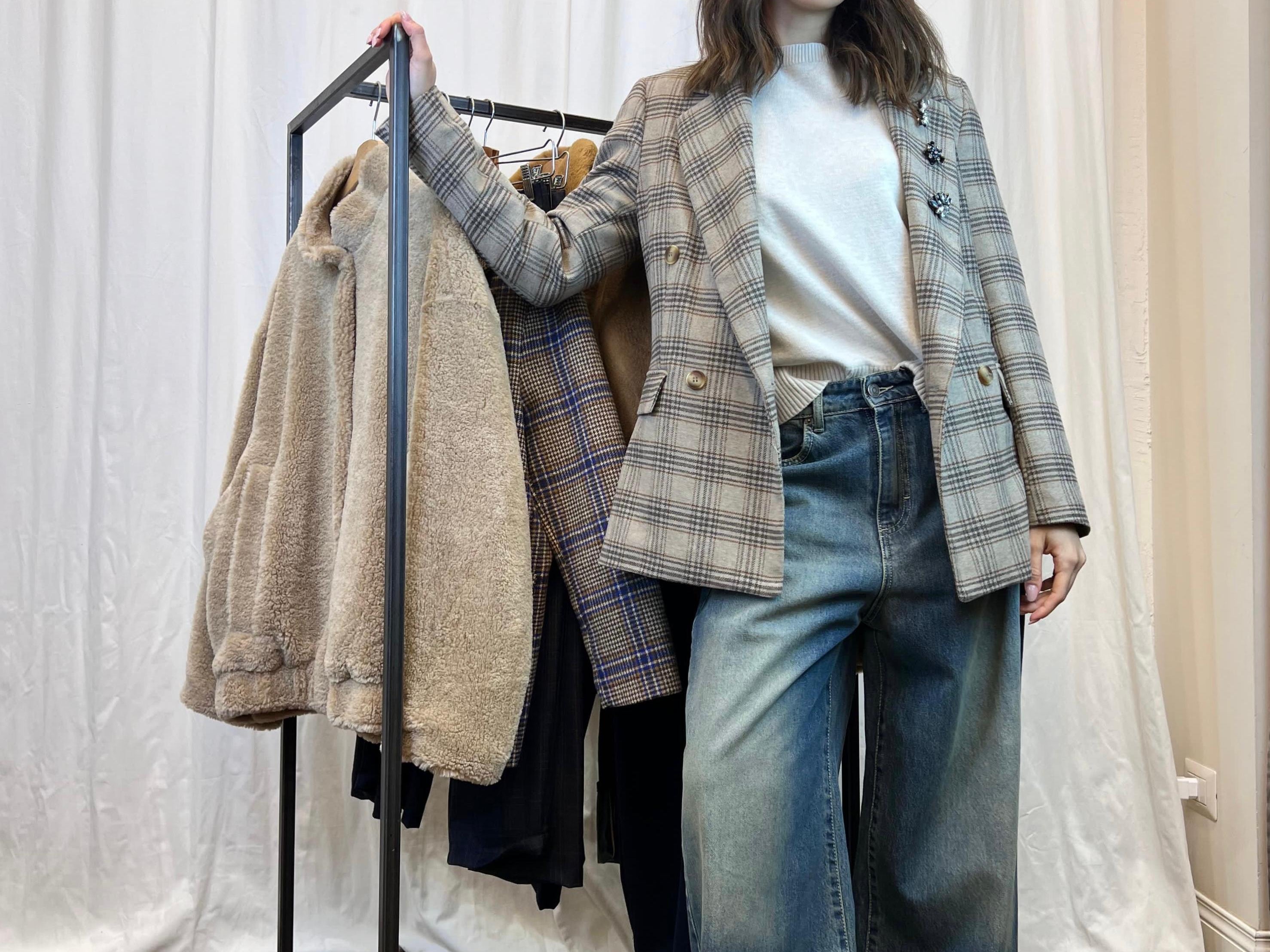 Outfit effortless chic con blazer a quadri dal taglio sartoriale e jeans a gamba larga Tensione In. Un outfit versatile e raffinato, perfetto per il giorno in ufficio o una passeggiata in città, con dettagli minimal e massimo comfort.