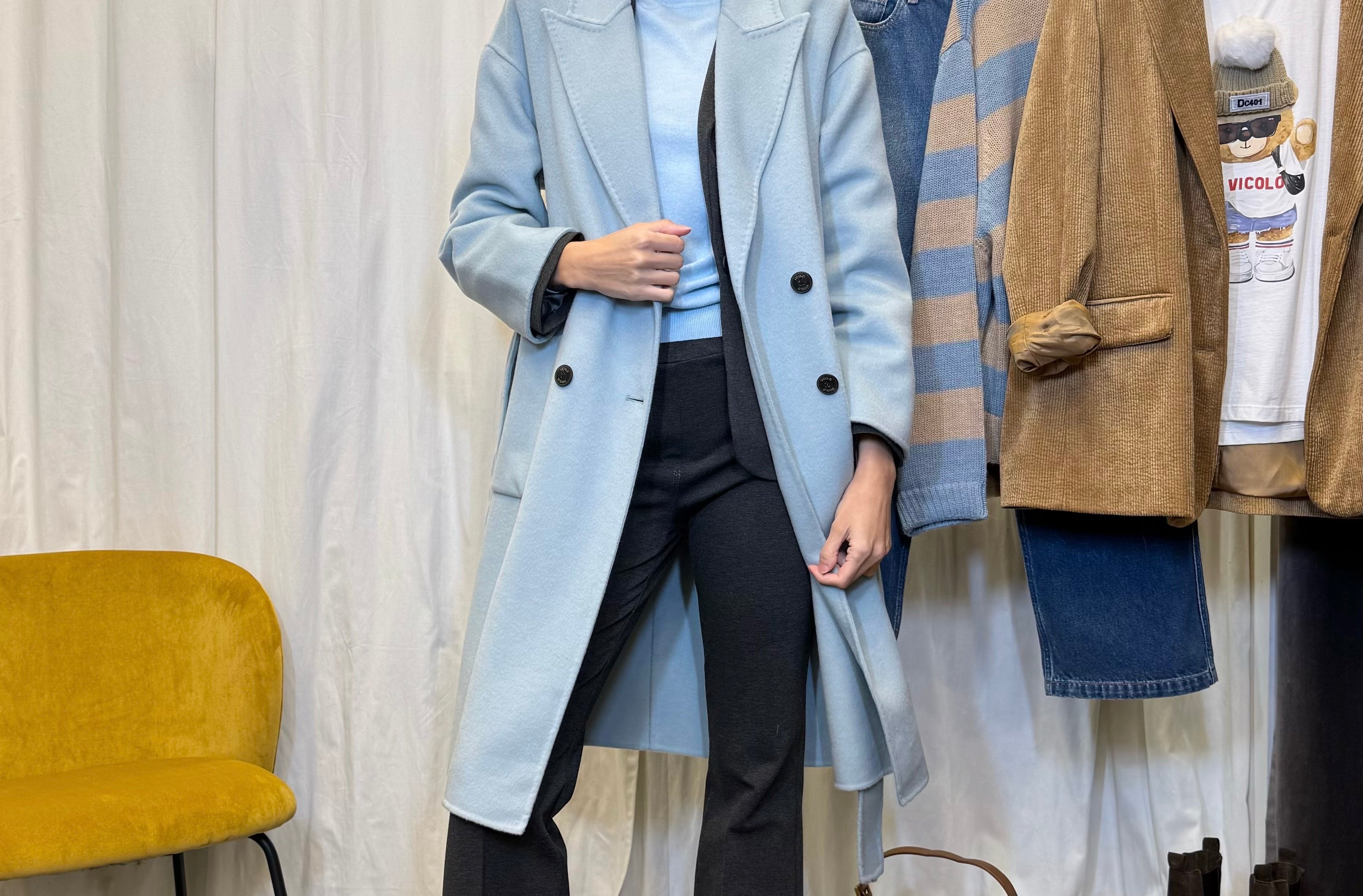 Scopri l'eleganza intramontabile del cappotto celeste pastello, abbinato al dolcevita coordinato per un look chic e raffinato. Completa l'outfit con pantaloni a zampa in tessuto grigio scuro e décolleté con fiocco per un tocco di classe. Perfetto per il lavoro o un'uscita glamour in città, questo look fonde comfort e stile. Aggiungi un accessorio iconico per esprimere la tua personalità. Acquista ora su Blackoutroma e rendi unico il tuo guardaroba!