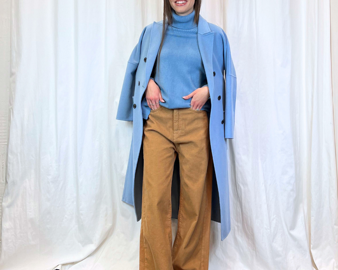 Eleganza super soft per questo outfit che mixa toni freddi e toni caldi. Abbiamo un elegante dolce vita in celeste che si sposa perfettamente con il cappotto handmade di Vicolo degli stessi toni. Per il pantalone scegliamo invece il camel, una tonalità neutra, una delicata gradazione del marrone, versatile, senza tempo che regala raffinatezza. Puoi scegliere questo look per una giornata in ufficio o anche per una passeggiata con le amiche. Tutti i capi li trovi sul nostro sito: approfittane per rinnovare ora il tuo guardaroba!